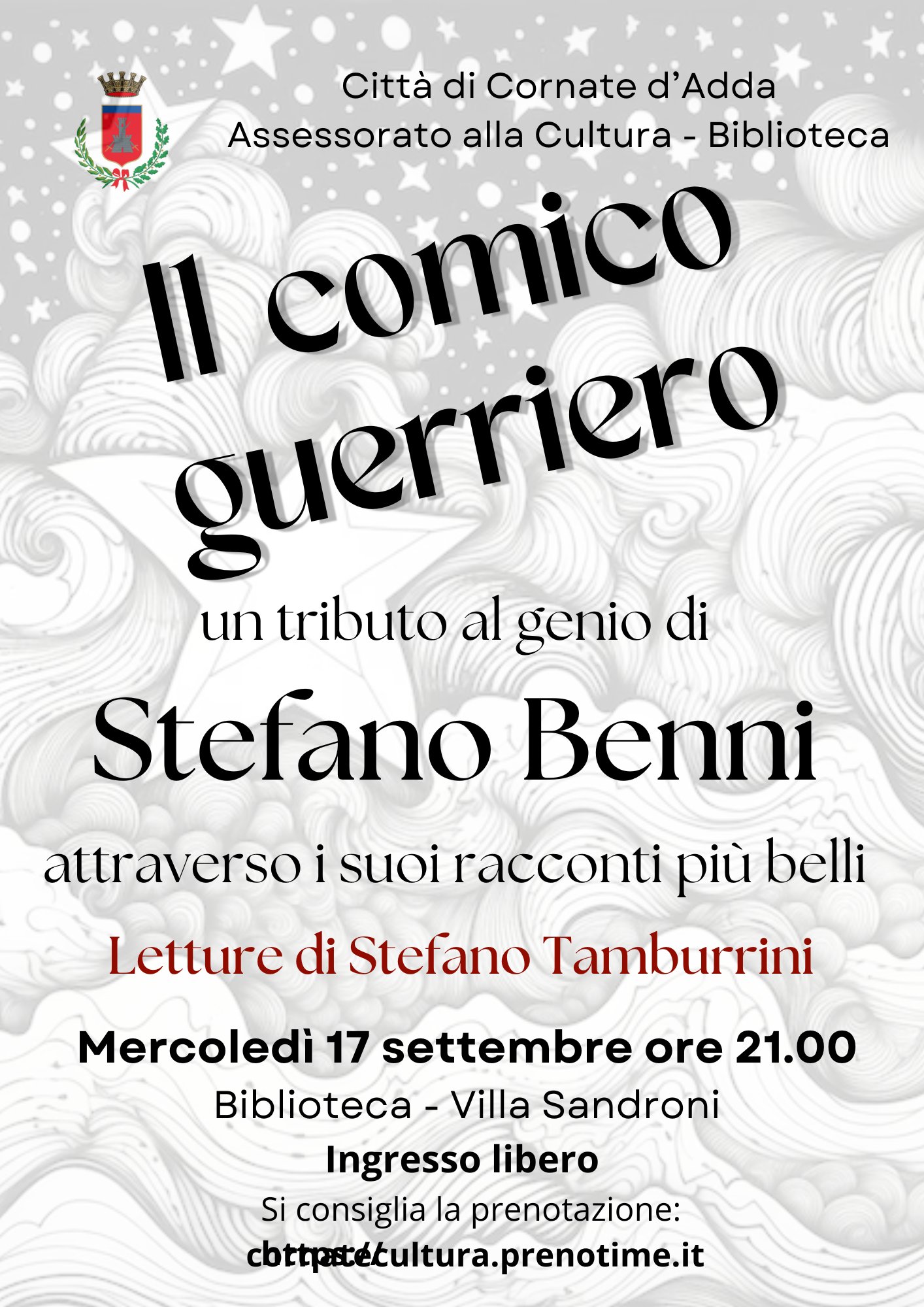 Nei giorni scorsi è venuto a mancare lo scrittore Stefano Benni: per ricordarlo la nostra Biblioteca ha organizzato uno spettacolo di sue letture, a cura di Stefano Tamburrini. Appuntamento mercoledì 17 settembre alle ore 21 nella Biblioteca civica, in Villa Sandroni. Ingresso gratuito, ma è consigliata la prenotazione sul portale https://cornatecultura.prenotime.it/