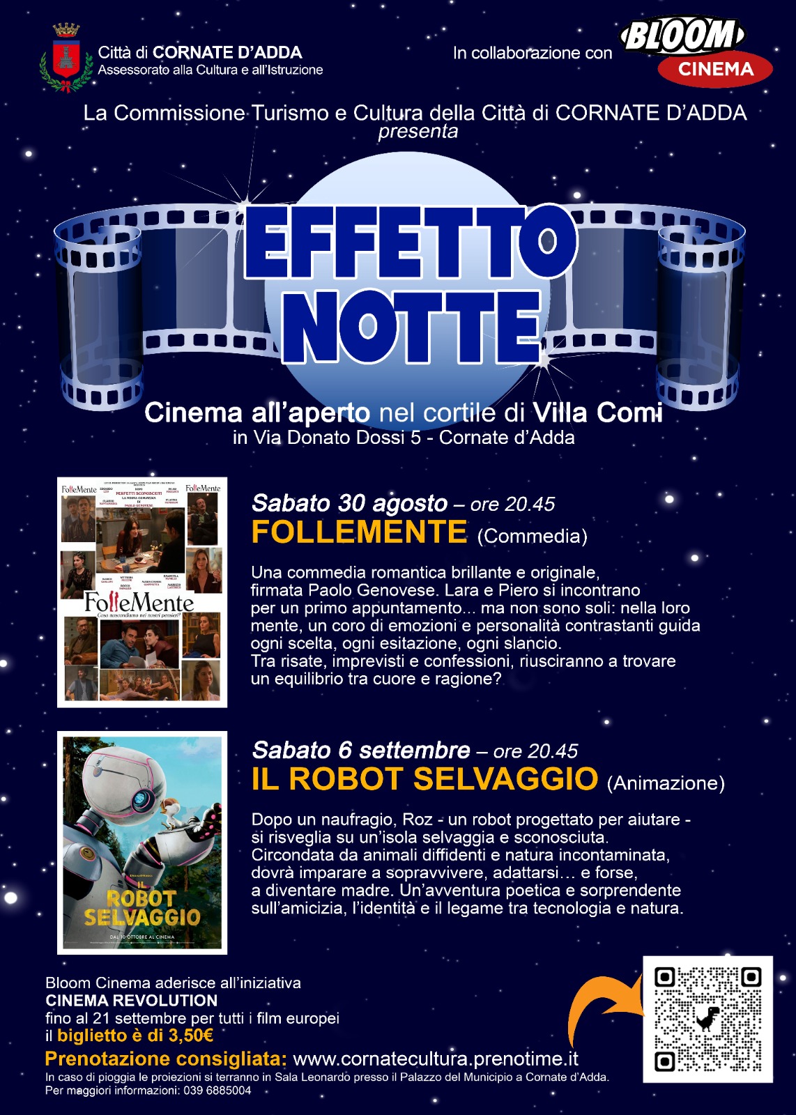 Primo appuntamento con "Effetto Notte", la rassegna cinematografica all'aperto organizzata dall'Amministrazione comunale di Cornate in collaborazione con il Bloom di Mezzago. Sabato 30 agosto, a partire dalle 20.45, il cortile di Villa Comi ospiterà la proiezione di "Follemente", una commedia brillante e originale di Paolo Genovese. Prenotazione consigliata su bit.ly/cornatecultura - biglietto a € 3.50 per l’iniziativa Cinema Revolution, da pagare in loco. In caso di pioggia le proiezioni si terranno in Sala Leonardo presso il Municipio, in via Volta 29.