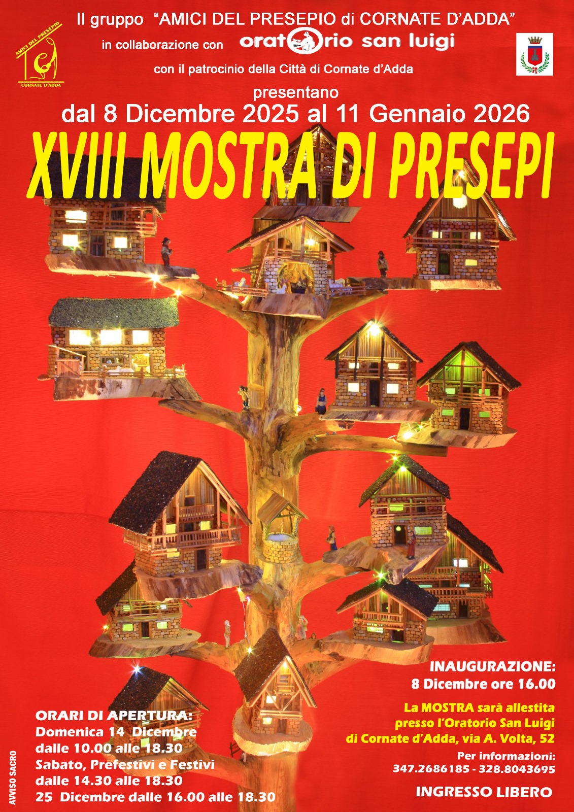 Torna come ogni anno l'appuntamento con la tradizionale "Mostra dei Presepi", giunta alla sua 18esima edizione. L'esposizione, organizzata dagli Amici del Presepio di Cornate (con la collaborazione dell'Oratorio San Luigi), sarà allestita presso i saloni dell'Oratorio San Luigi, in via Volta 52.