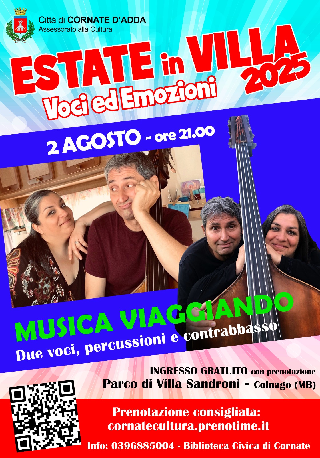 Nuovo appuntamento con Estate in Villa 2025. Sabato 2 agosto Villa Sandroni ospiterà i "Musica Viaggiando": voci, percussioni e contrabbasso regaleranno a tutti i presenti una serata magica. Inizio del concerto fissato per le 21. Ingresso gratuito con prenotazione consigliata sul portale https://cornatecultura.prenotime.it/