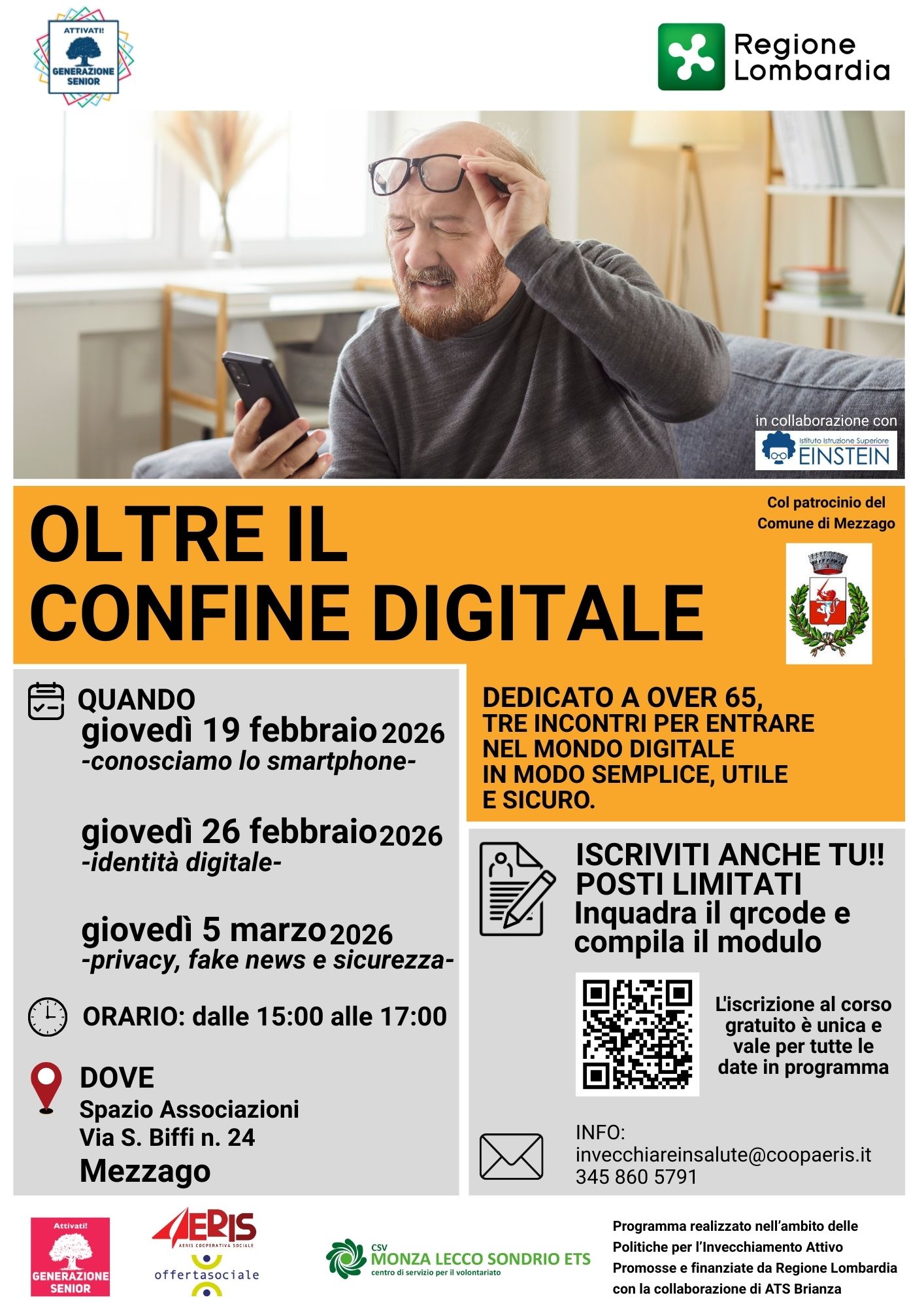- Concorezzo, dalle 15 alle 17 nella Sala Auditorium di Villa Zoja: 19 febbraio (Conosciamo lo smartphone), 26 febbraio (Identità digitale), 5 marzo (Privacy, fake news e sicurezza).
