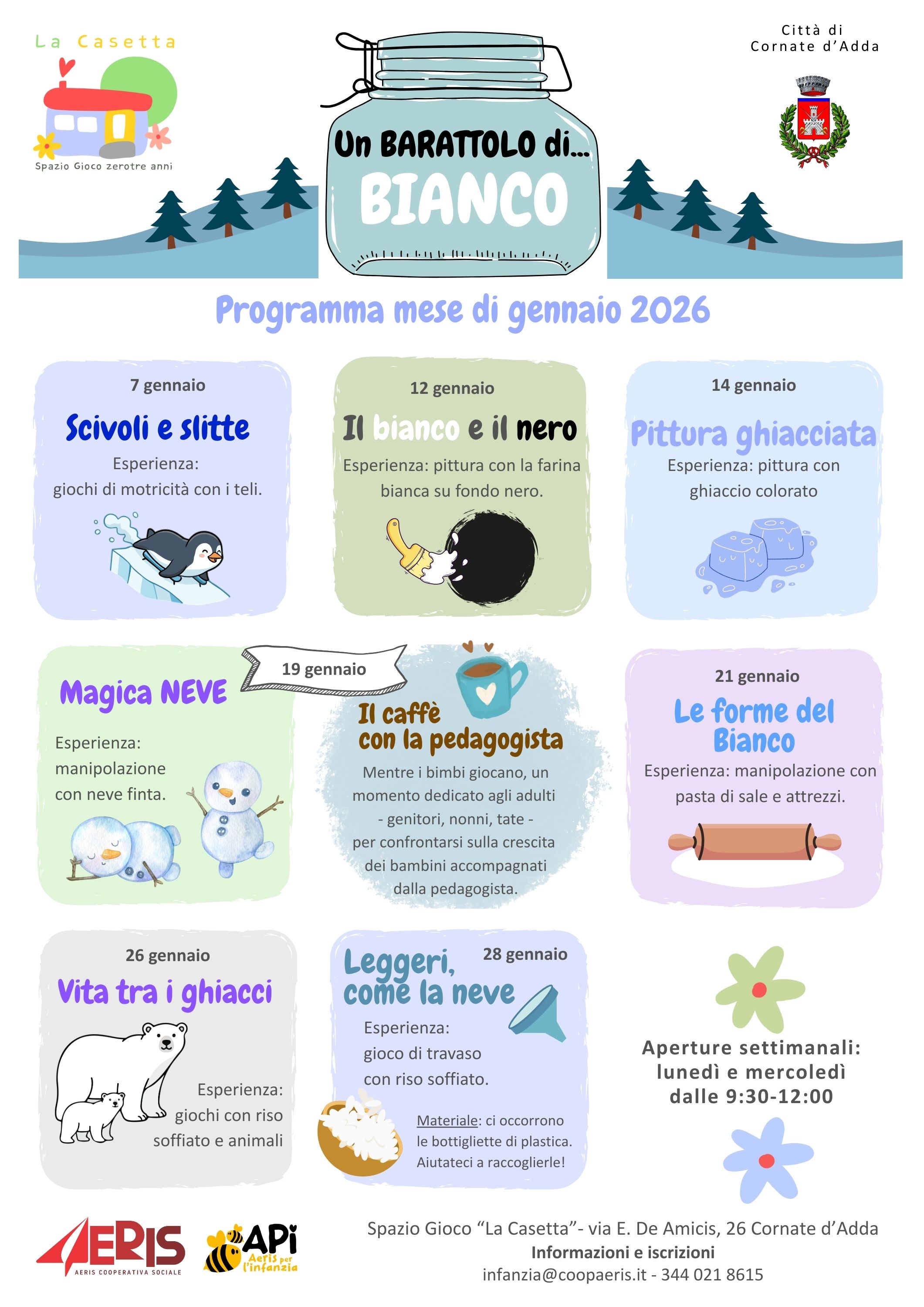 Allo Spazio Gioco "La Casetta" di via De Amicis il mese di gennaio è iniziato portando con sé "Un barattolo pieno di... bianco". Quante avventure ci aspettano: ecco il programma completo delle attività pensate per i bimbi dagli 0 ai 3 anni fino alla fine del mese.