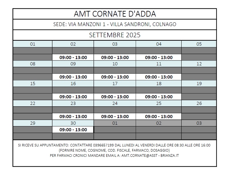 Lo trovi in Villa Sandroni (via Manzoni 2) e l’accesso all’Ambulatorio avviene solo su appuntamento, chiamando il numero unico Centralizzato di Asst Brianza 039.6657199 attivo dal lunedì al venerdì dalle ore 08.30 alle 16.00 oppure scrivendo una e-mail a amt.cornate@asst-brianza.it.