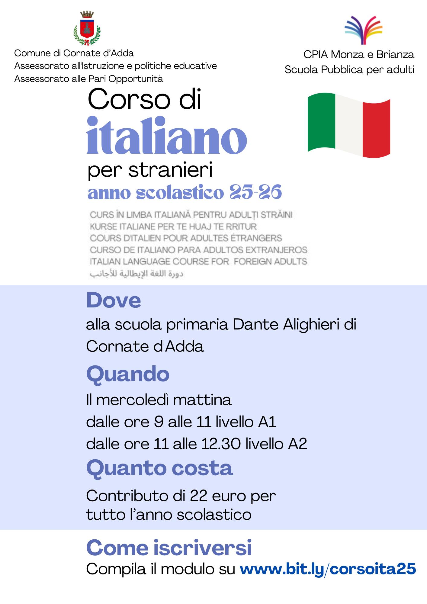 Il Comune di Cornate informa che è stato attivato un corso di italiano per stranieri per l'anno scolastico 2025/2026.