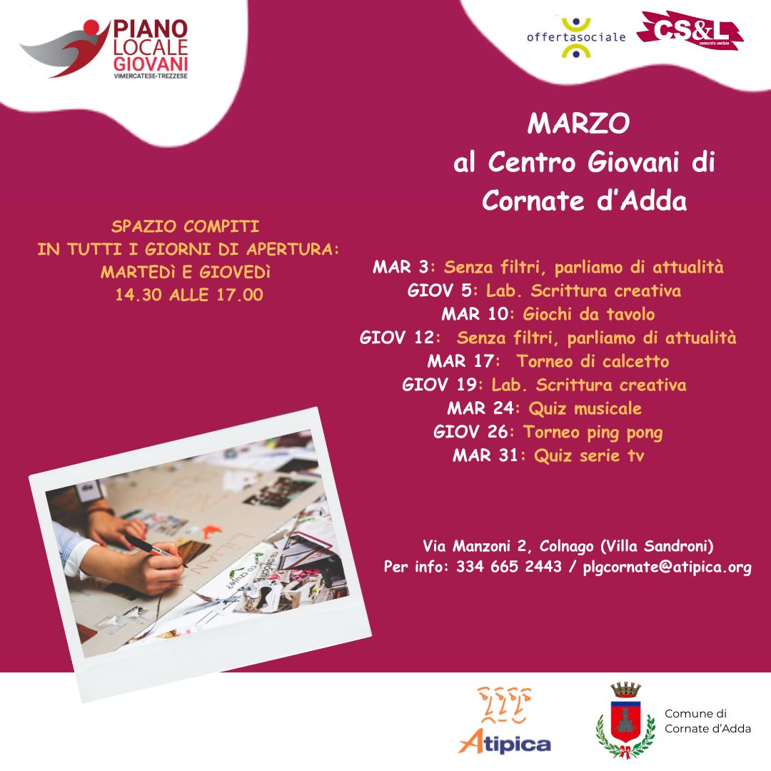 Come tutti i mesi, anche per marzo il Piano Locale Giovani di Cornate propone un interessante calendario di eventi dedicati ai ragazzi e alle ragazze (dagli 11 ai 22 anni) della città. Queste le iniziative in programma nelle prossime settimane: