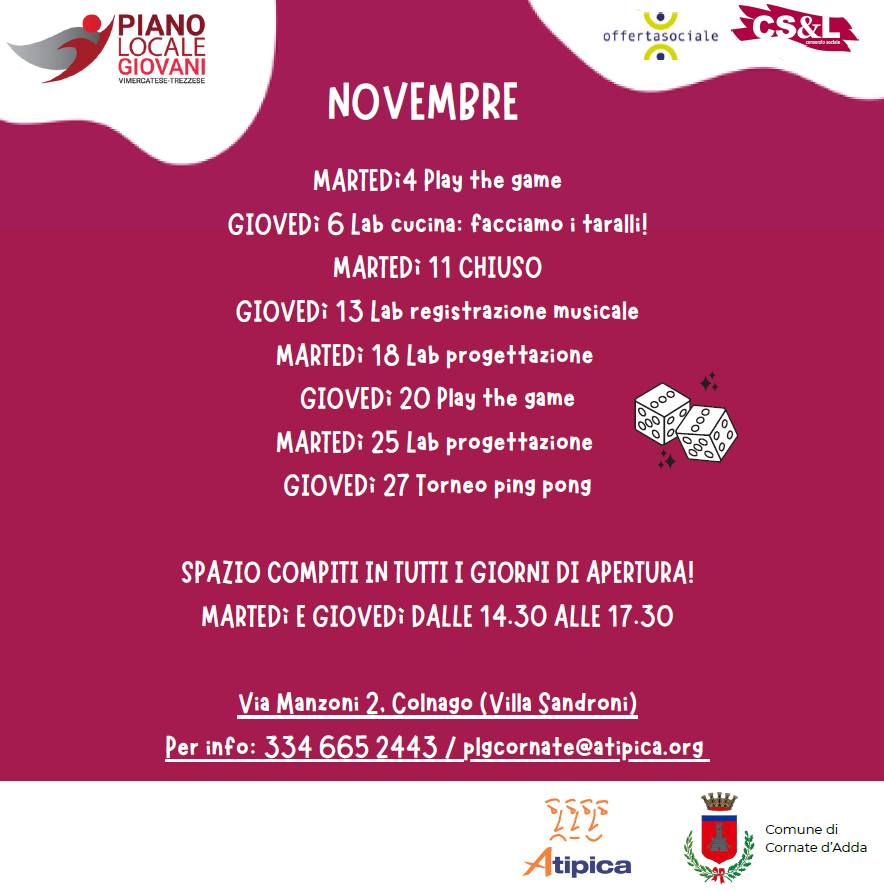 Nuovo mese, e nuovi appuntamenti organizzati dal Piano Locale Giovani di Cornate. Tante le iniziative pensate per i ragazzi e le ragazze del nostro territorio. L'appuntamento è, come sempre, il martedì e giovedì dalle 14.30 alle 17.30 in Villa Sandroni.