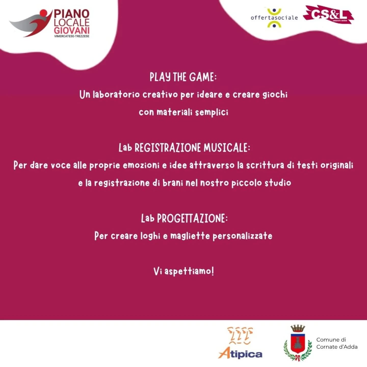 - Giovedì 13: Lab registrazione musicale (per dare voce alle proprie emozioni e idee attraverso la scrittura di testi originali e la registrazione di brani nel nostro piccolo sutdio);