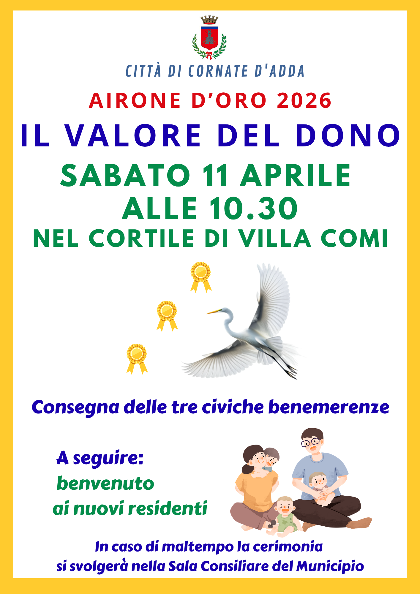 Al termine della cerimonia di consegna dell'Airone d'Oro andrà in scena il benvenuto ai neo residenti di Cornate d'Adda.