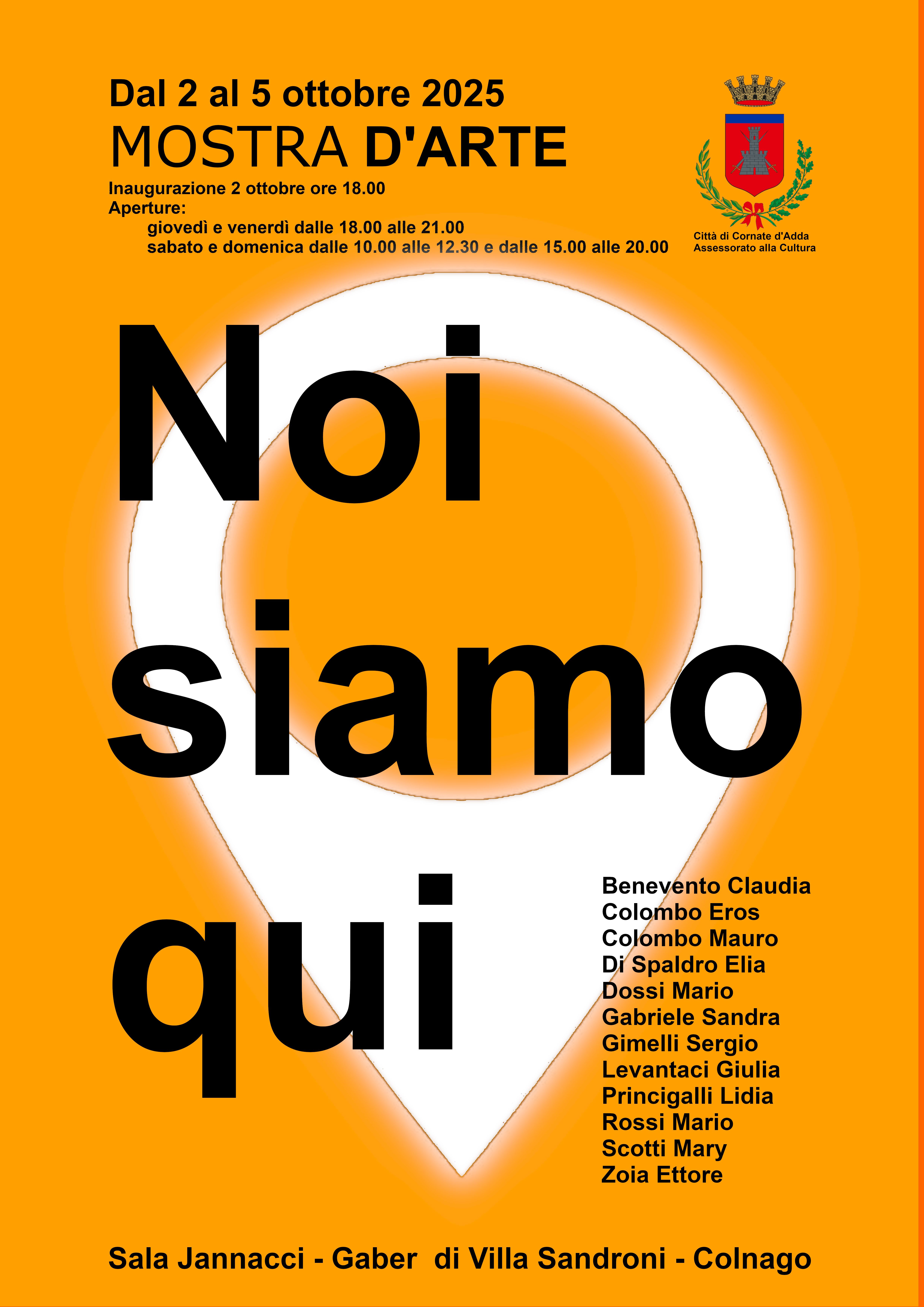 Dal 2 al 5 ottobre 2025, la Sala Jannacci - Gaber di Villa Sandroni, a Colnago, ospiterà la mostra d’arte "Noi siamo qui", promossa dall’Assessorato alla Cultura del Comune di Cornate d’Adda. Un appuntamento che celebra la creatività e il desiderio di raccontarsi degli artisti del nostro territorio.