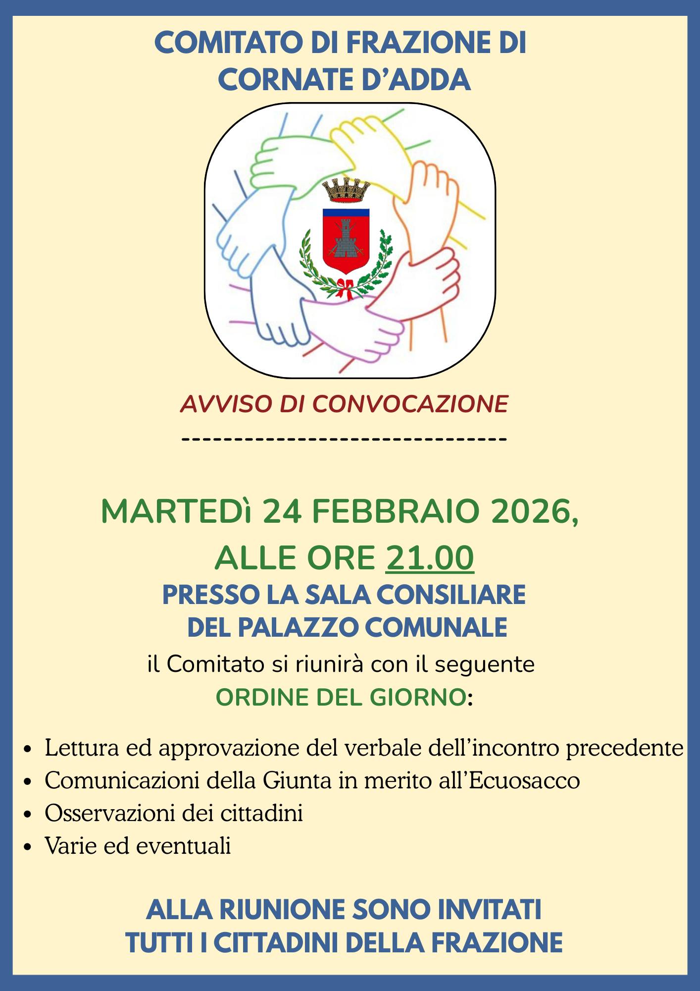 Successivamente sarà la volta del Comitato di Frazione di Cornate d'Adda, che si riunirà nella Sala Consiliare del Municipio martedì 24 febbraio alle 21 con il seguente Ordine del giorno: