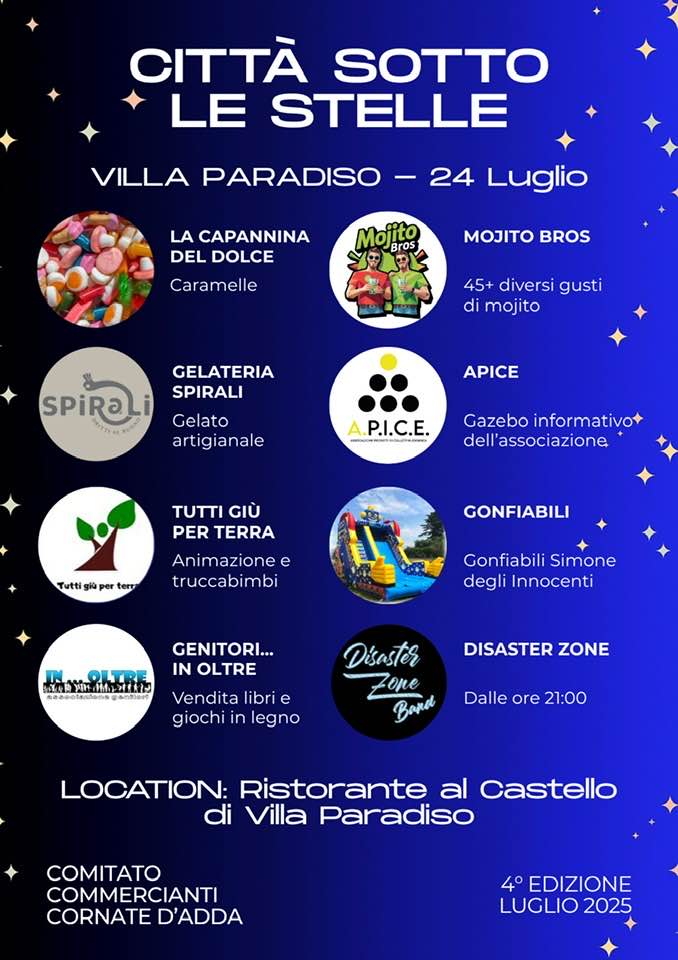Quarto e ultimo appuntamento con "Città sotto le stelle", la kermesse estiva organizzata dal Comitato Commercianti di Cornate con il patrocinio del Comune e la collaborazione di Protezione civile e Confcommercio Vimercate. Dopo il grande successo di Cornate, Porto e Colnago, giovedì sera è la volta di Villa Paradiso. Bancarelle, gonfiabili, musica, street food, attrazioni sportive e molto altro animeranno il cortile del Castello.