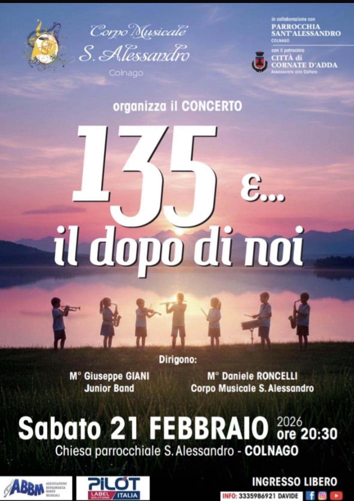 Il concerto, a cura del Corpo musicale Sant'Alessandro e patrocinato dal Comune di Cornate d'Adda, vedrà protagonisti i Maestri Giuseppe Giani (Junior Band) e Daniele Roncelli (Corpo musicale Sant'Alessandro).