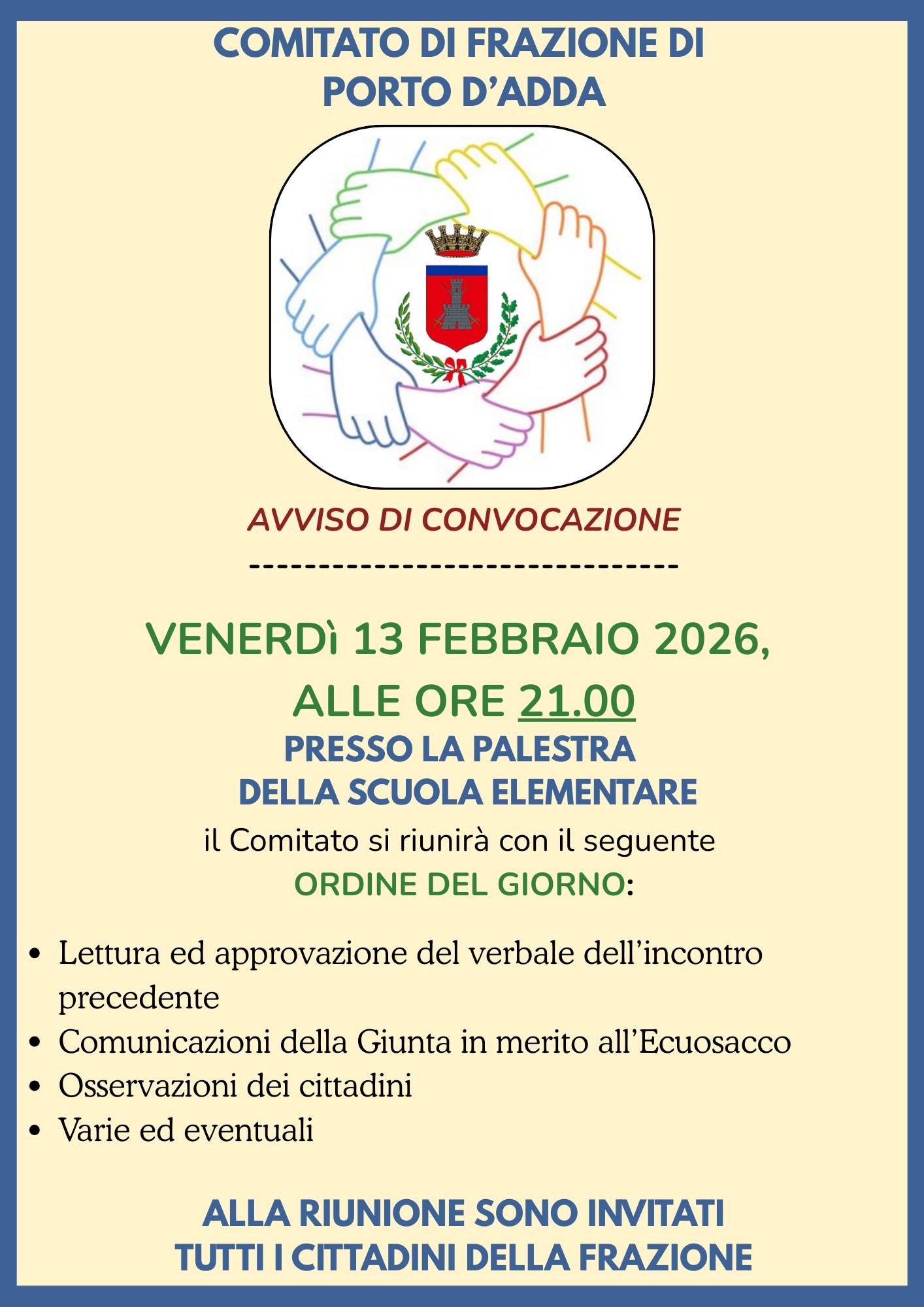 Primo appuntamento dell'anno con il Comitato di Frazione di Porto d'Adda. L'incontro è previsto venerdì 13 febbraio alle 21 all'interno della Scuola Leonardo da Vinci. Questo l'Ordine del giorno della serata: