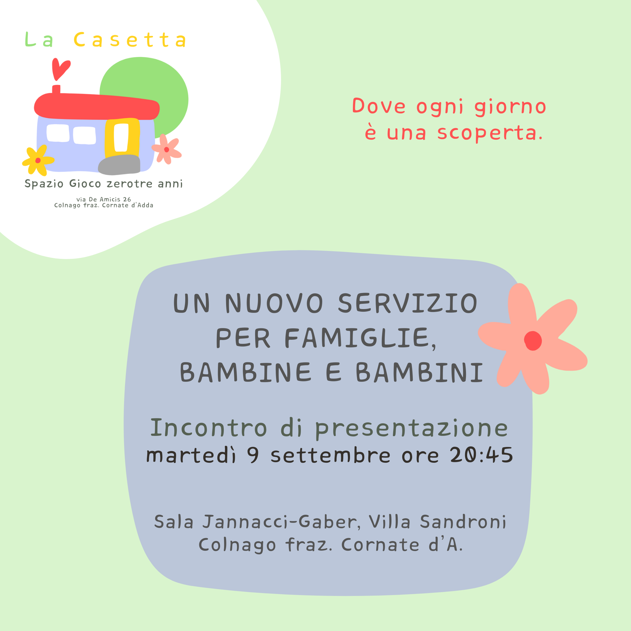 "La Casetta": questo il nome dello Spazio Gioco che verrà attivato, con la collaborazione della cooperativa sociale Aeris, in via De Amicis 26, a Colnago. Pensata per bambini dagli 0 ai 3 anni, la struttura verrà intitolata a Maria Mauri, storica maestra di Cornate scomparsa nel 2008. Tre gli appuntamenti da segnare sul calendario. Si comincia martedì 9 settembre alle ore 20.45, Sala Jannacci-Gaber di Villa Sandroni: incontro di presentazione alle famiglie del nuovo servizio.