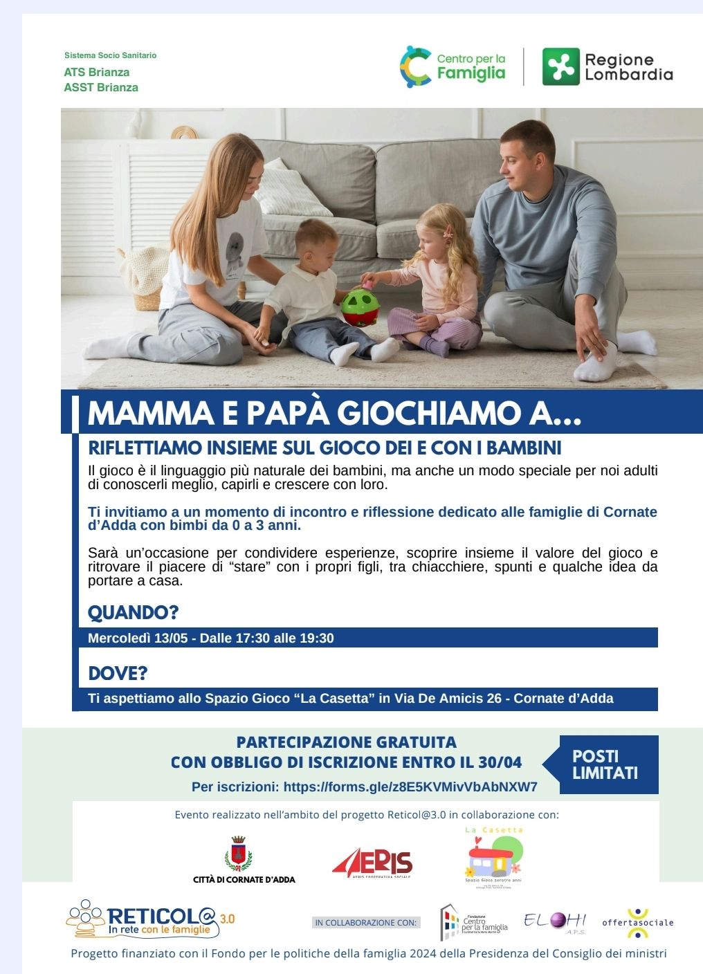 Dalle 17.30 alle 19.30, infatti, si terrà "Mamma e Papà...giochiamo a?", un’occasione speciale per fermarsi, condividere e riscoprire il valore del gioco insieme ai propri bambini. Un momento di riflessione, condivisione e semplicità… perché a volte basta poco per stare davvero insieme.