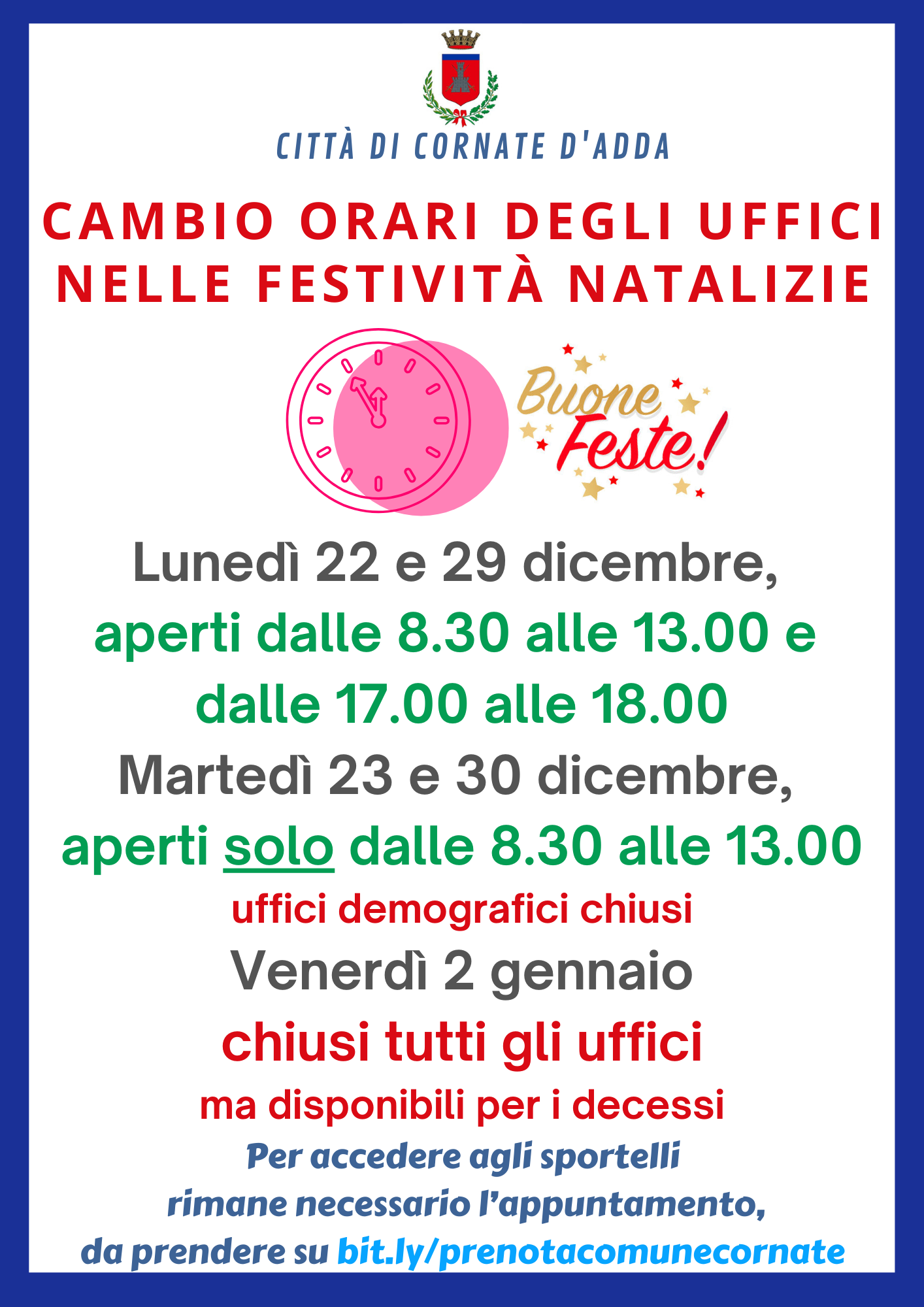 - martedì 23 e 30 dicembre, solo dalle 8.30 alle 13.00; gli uffici demografici rimarranno chiusi.