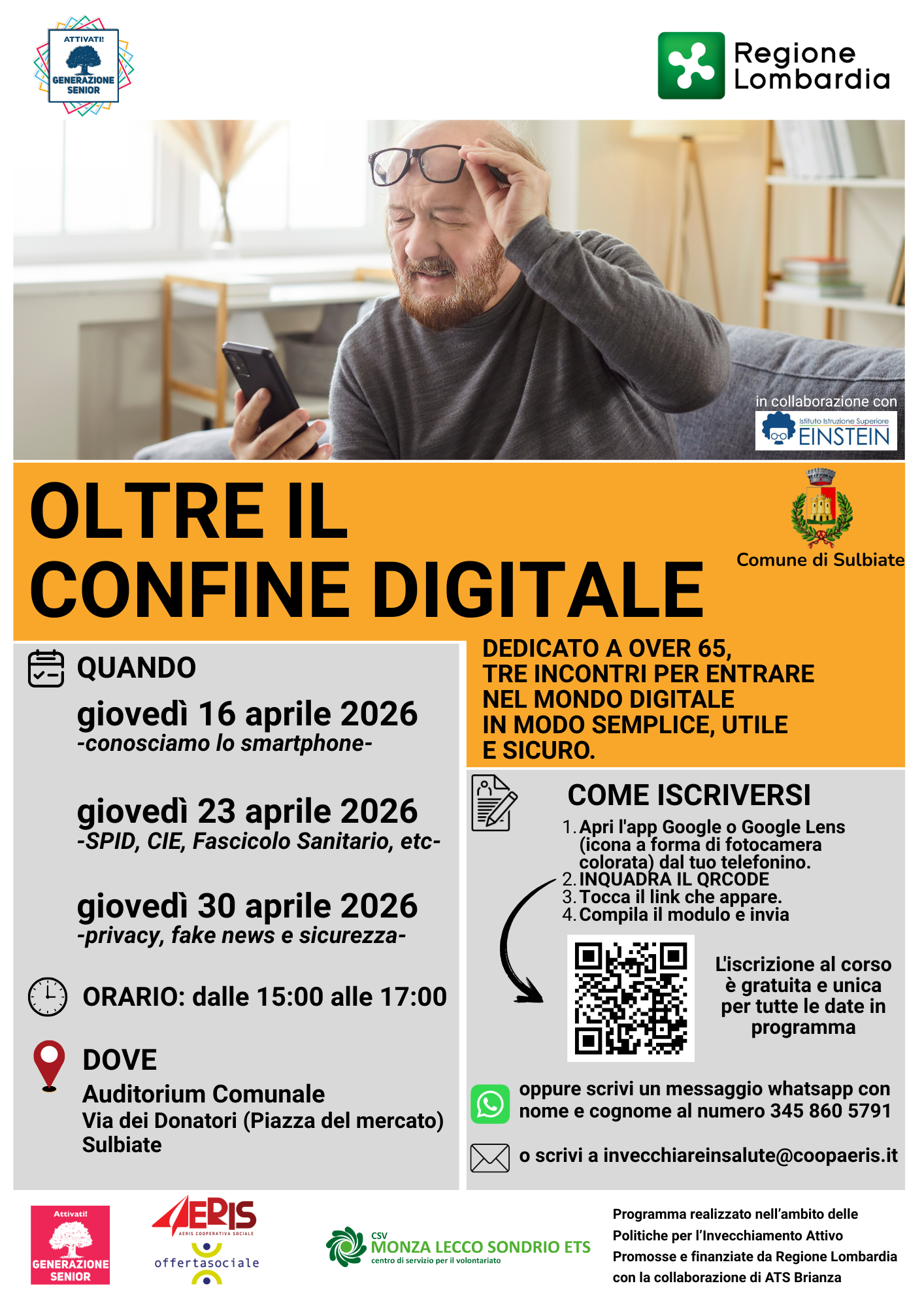- Sulbiate, dalle 15 alle 17 nell'Auditorium comunale di via dei Donatori: 16 aprile (Conosciamo lo smartphone), 23 aprile (Identità digitale), 30 aprile (Privacy, fake news e sicurezza).