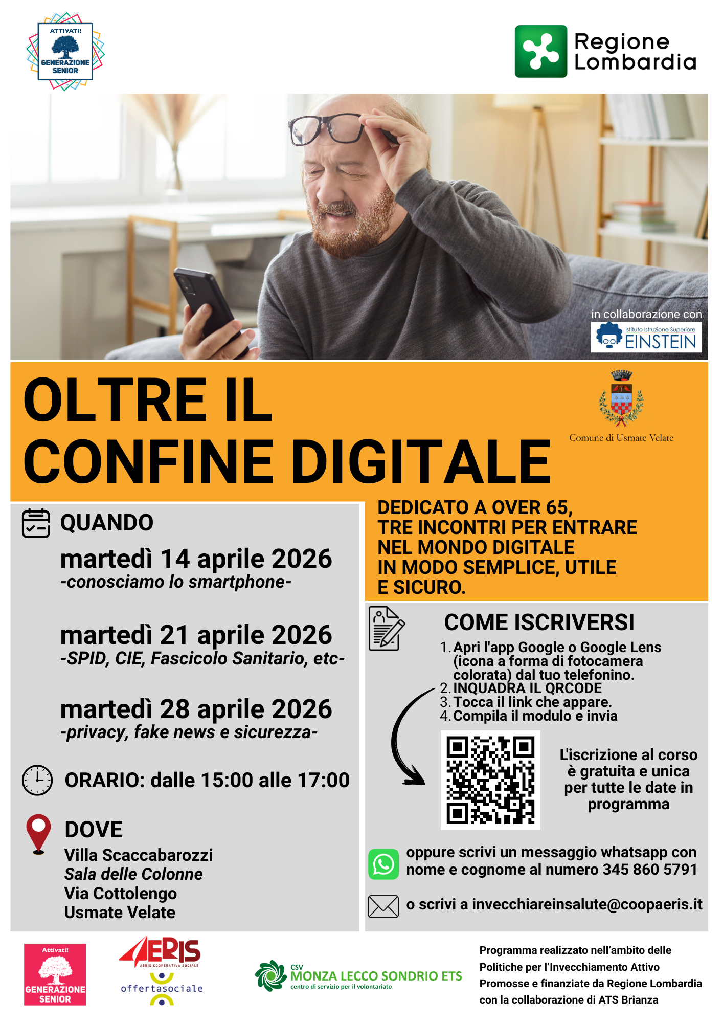 - Usmate Velate, dalle 15 alle 17 nella Sala delle Colonne di Villa Scaccabarozzi (via Cottolengo): 14 aprile (Conosciamo lo smartphone), 21 aprile (Spid, Cie, ecc), 28 aprile (Privacy, fake news e sicurezza);