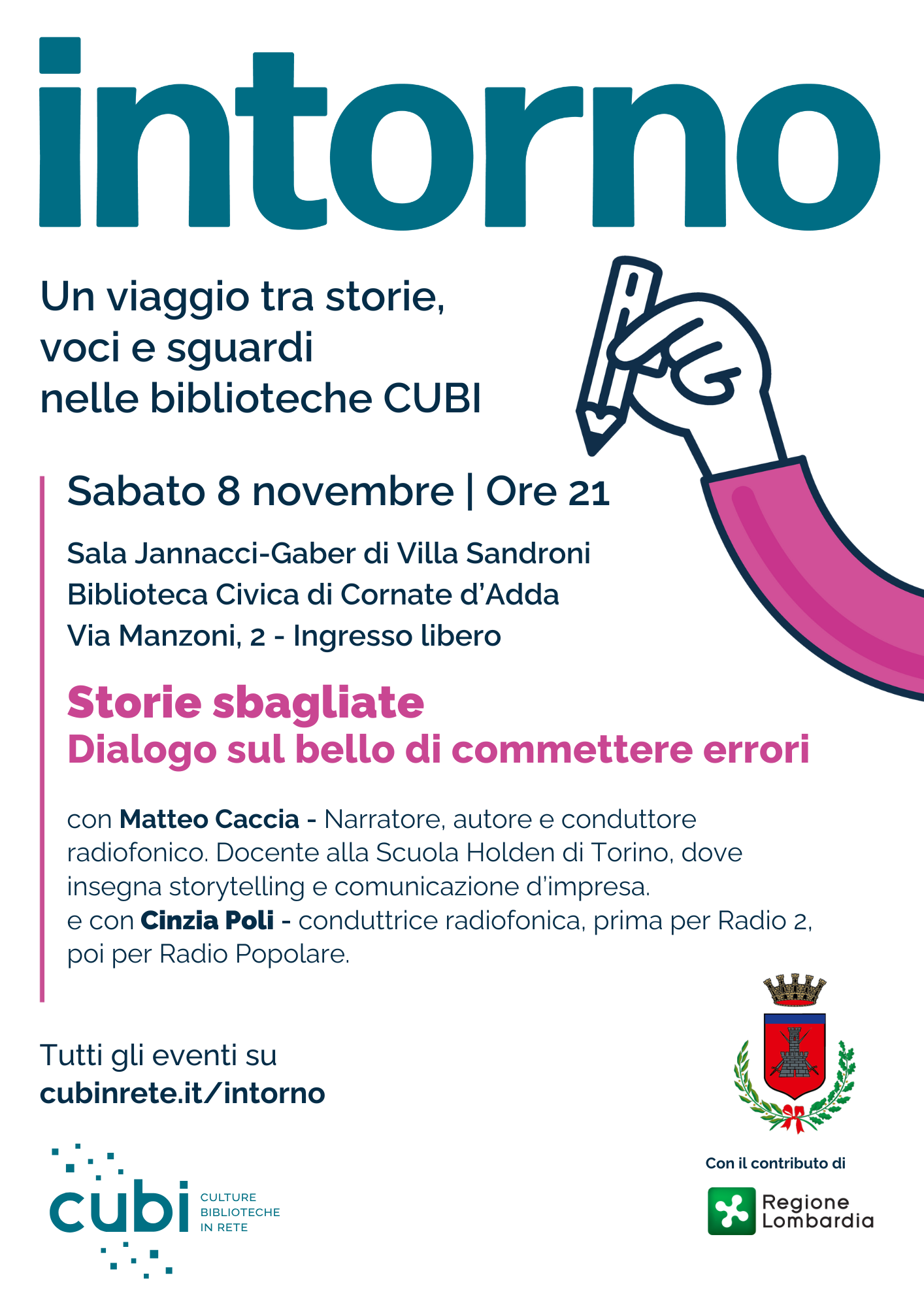 Sabato 8 novembre alle ore 21:00, la sala Jannacci-Gaber di Villa Sandroni a Colnago ospiterà l’incontro “Storie Sbagliate”, un dialogo tra Matteo Caccia e Cinzia Poli sul valore degli errori e il potere delle narrazioni imperfette.